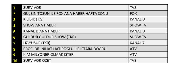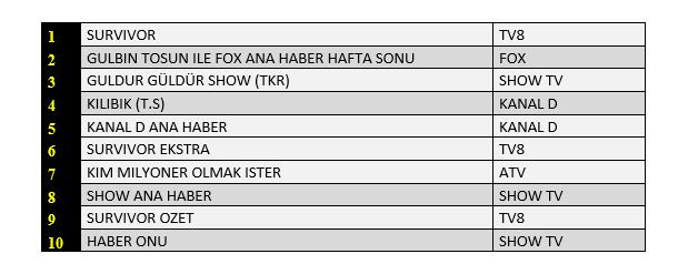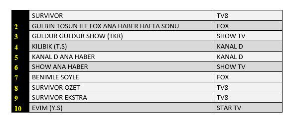 AB'de ise 1. sırada “Survivor”, 2. sırada “Gülbin Tosun İle Fox Ana Haber Hafta Sonu”, 3. sırada “Güldür Güldür Show”un tekarı yer aldı.