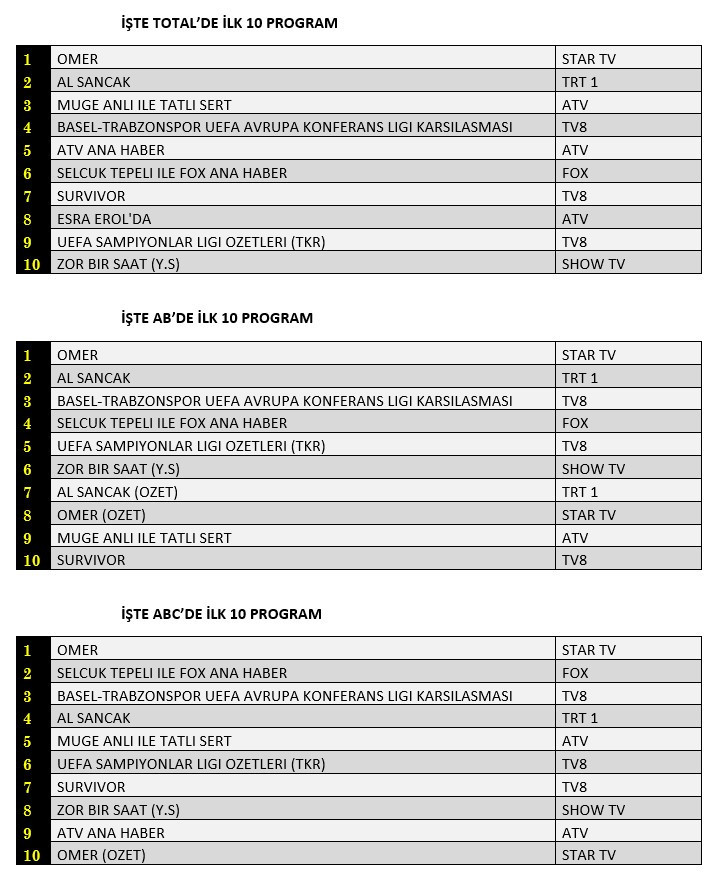 AB'de ise 1. sırada “Ömer”, 2. sırada yine “Al Sancak”, 3. sırada TV8’de yayınlanan “Basel-Trabzonspor UEFA Avrupa Konferans Ligi Karşılaşması” yer aldı.