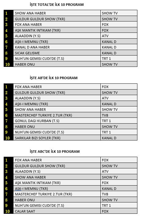 AB'de ise 1. sırada “Fox Ana Haber”, 2. sırada “Güldür Güldür Show”un tekrarı 3. sırada ATV’de yayınlanan “Alaaddin” isimli yabancı sinema yer aldı.