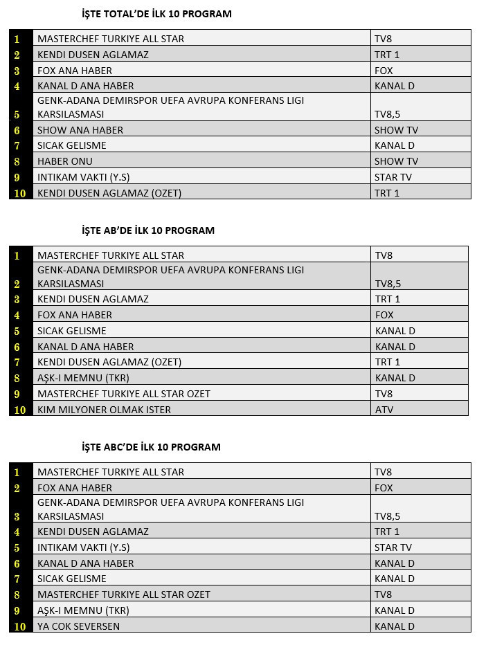 AB'de ise 1.sırada “Masterchef Türkiye All Star”, 2.sırada TV8,5’da ekrana gelen “Genk-Adana Demirspor UEFA Avrupa Konferans Ligi Karşılaşması”, 3.sırada “Kendi Düşen Ağlamaz” yer aldı.