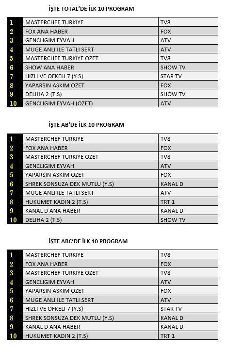 AB'de ise 1. sırada “Mastercheff Türkiye”, 2. sırada “Fox Ana Haber”, 3. sırada “Mastercheff Türkiye Özet” yer aldı.