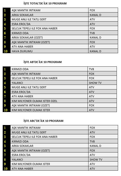 AB'de ise 1. sırada TV8’de yayınlanan “Kırmızı Oda”, 2. sırada “Aşk Mantık İntikam” 3. sırada “Selçuk Tepeli İle Fox Ana Haber” yer aldı.