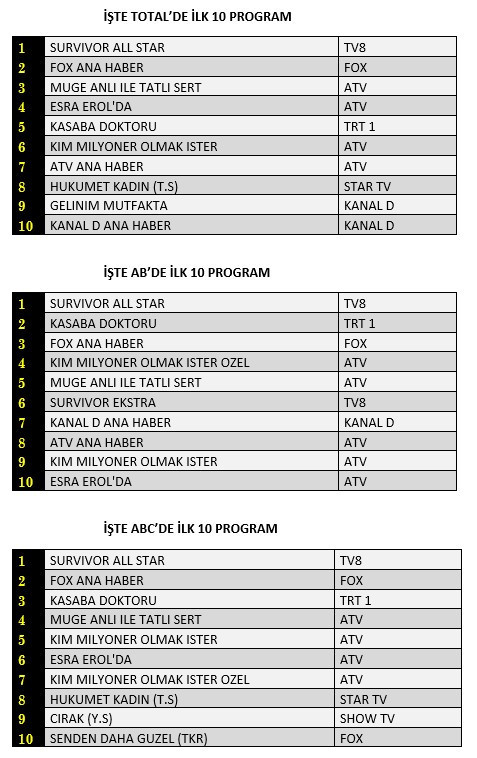 AB'de ise 1. sırada “Survivor All Star”, 2. sırada TRT1’de yayınlanan “Kasaba Doktoru” 3. sırada “Fox Ana Haber” yer aldı.