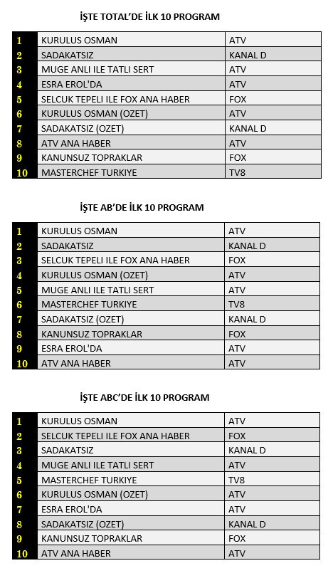 AB'de ise 1. sırada “Kuruluş Osman”, 2. sırada “Sadakatsiz” 3. sırada “Selçuk Tepeli İle Fox Ana Haber” yer aldı.