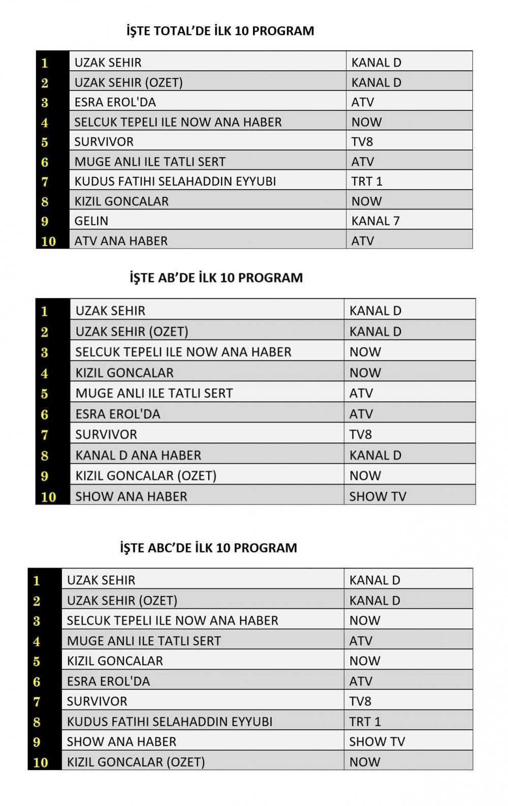 ABC grubunda da "Uzak Şehir" zirvede kalırken, haber bülteni sıralamada yerini korudu.