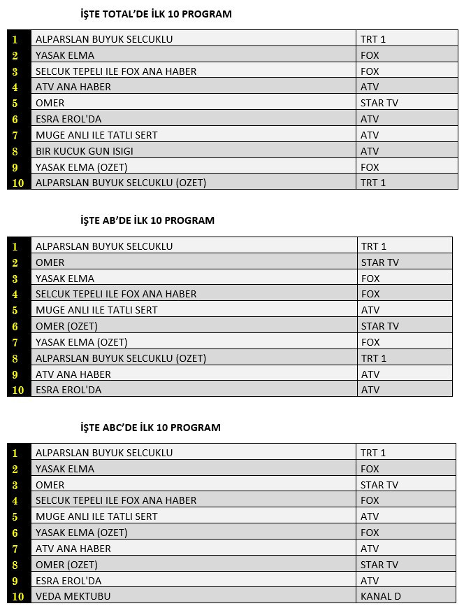 AB'de ise 1.sırada “Alparslan Büyük Selçuklu”, 2.sırada Star TV’de yayınlanan “Ömer”, 3.sırada “Yasak Elma” yer aldı.
