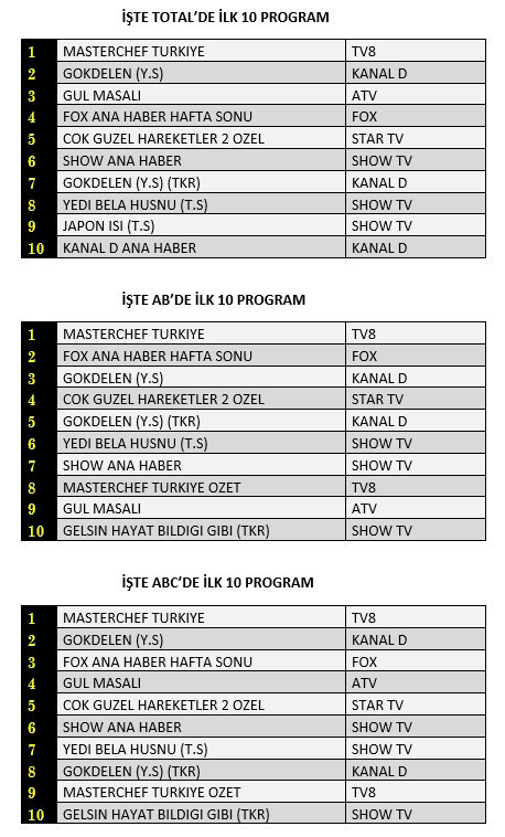 AB'de ise 1.sırada “Masterchef Türkiye”, 2.sırada “Fox Ana Haber Hafta Sonu” 3.sırada Kanal D’de yayınlanan yabancı sinema “Gökdelen” yer aldı.