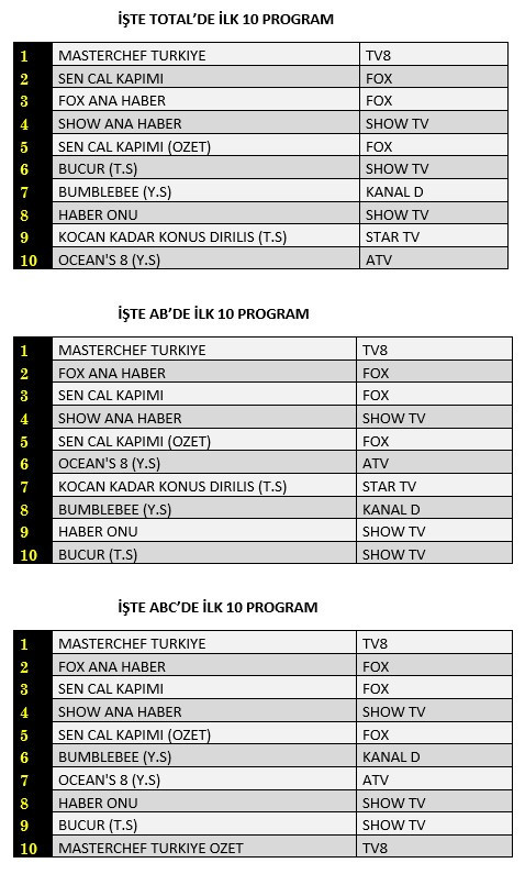 Total'de 1. sırada TV8’de ekrana gelen “Masterchef Türkiye”, 2. sırada Fox TV’de yayınlanan “Sen Çal Kapımı”, 3. sırada “Fox Ana Haber” yer aldı.