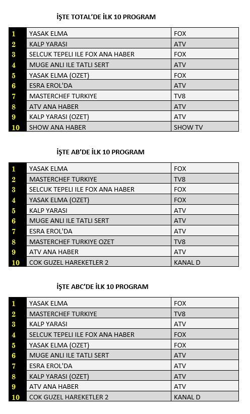 Total'de 1. sırada Fox TV’de yayınlanan “Yasak Elma” 2. sırada ATV’de izleyiciyle buluşan “Kalp Yarası”, 3. sırada “Selçuk Tepeli İle Fox Ana Haber” yer aldı.