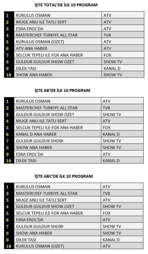 AB'de ise 1.sırada “Kuruluş Osman”, 2.sırada TV8’de yayınlanan “Masterchef Türkiye All Star”, 3.sırada Show TV’de ekrana gelen “Güldür Güldür Show”un özeti yer aldı.