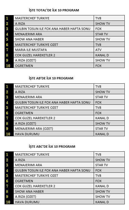 AB'de ise 1. sırada “Masterchef Türkiye”, 2. sırada “A.Rıza”, 3. sırada Star TV’de yayınlanan "Menajerimi Ara” yer aldı.