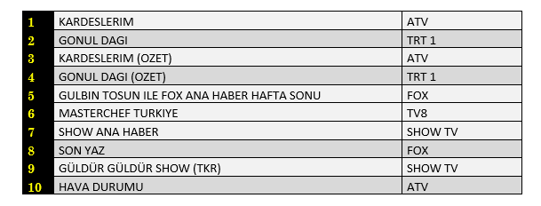 Total'de 1. sırada ATV’de izleyiciyle buluşan ‘Kardeşlerim’, 2. sırada TRT 1’de yayınlanan ‘Gönül Dağı’, 3. sırada ise ‘Kardeşlerim’ dizisinin özet bölümü yer aldı.