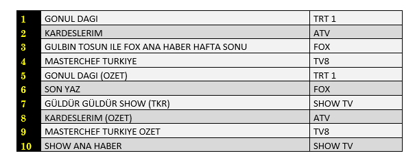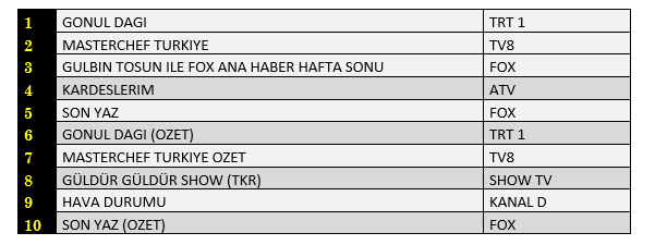 AB'de ise 1. sırada ‘Gönül Dağı’, 2. sırada ‘MasterChef Türkiye’, 3. sırada ise ‘Gülbin Tosun ile Fox Ana Haber Hafta Sonu’ yer aldı.