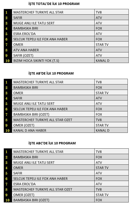 AB'de ise 1. sırada “Masterchef Türkiye All Star”, 2. sırada Fox Tv’de ekrana gelen “Bambaşka Biri”, 3. sırada Star Tv’de yayınlanan “Ömer” yer aldı.