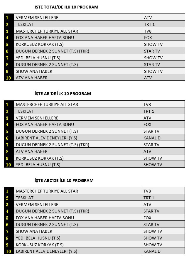 AB'de ise 1. sırada “Masterchef Türkiye All Star”, 2.sırada “Teşkilat”, 3. sırada “Vermem Seni Ellere” yer aldı.