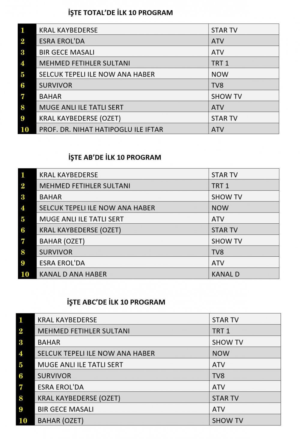 Bugün, Türkiye televizyonlarında yayınlanan programların reyting sonuçları belli oldu. İşte Total, AB ve ABC kategorilerindeki ilk üç sıralama:
