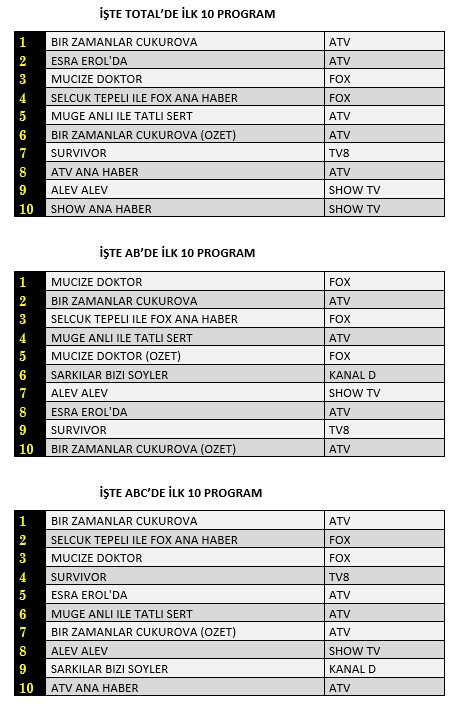 Total'de 1. sırada ATV’de ekrana gelen “Bir Zamanlar Çukurova”, 2. sırada ATV’de izleyiciyle buluşan “Esra Erol’da” programı, 3. sırada Fox TV’de yayınlanan “Mucize Doktor” programı yer aldı.