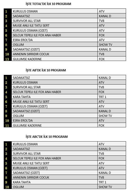 Total'de 1. sırada ATV’de izleyiciyle buluşan “Kuruluş Osman”, 2. sırada Kanal D’de ekranlara veda eden “Sadakatsiz”, 3. sırada TV8’de yayınlanan “Survivor All Star” yer aldı.