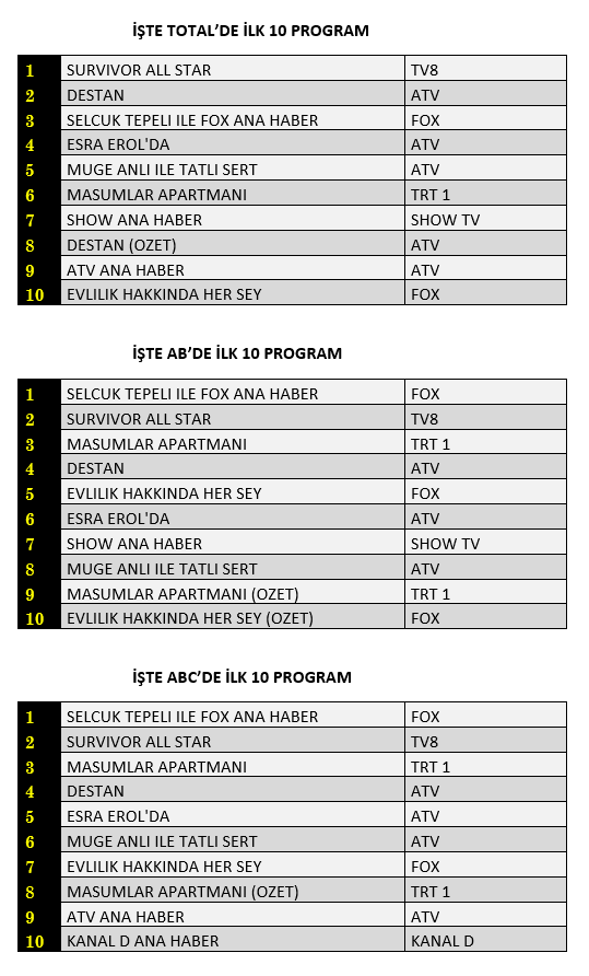 AB'de ise 1. sırada “Selçuk Tepeli İle Fox Ana Haber”, 2. sırada “Survivor All Star” 3. sırada TRT1’de yayınlanan “Masumlar Apartmanı” yer aldı.