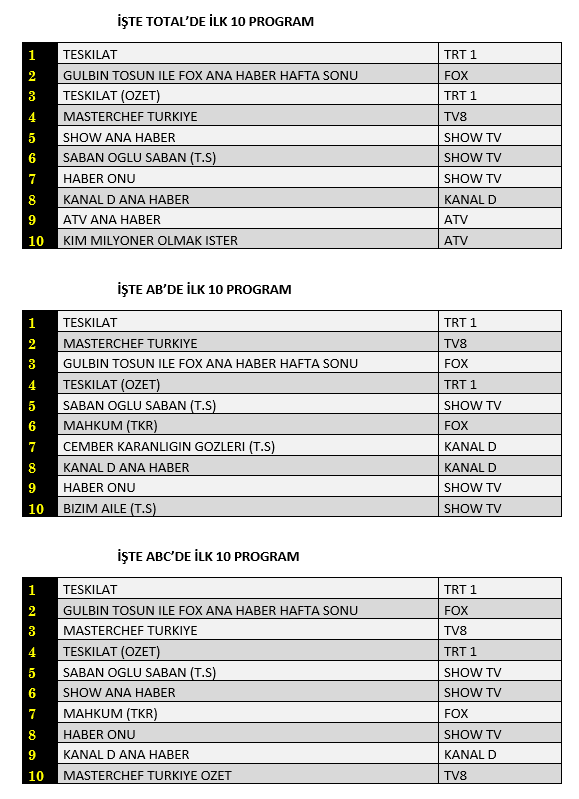 AB'de ise 1. sırada “Teşkilat”, 2. sırada TV8’de yayınlanan “Masterchef Türkiye” 3. sırada “Gülbin Tosun İle Fox Ana Haber Hafta Sonu” yer aldı.
