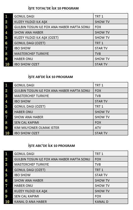 Total'de 1. sırada TRT1’de yayınlanan “Gönül Dağı”, 2. sırada Show TV’de ekrana gelen “Kuzey Yıldızı İlk Aşk”, 3. sırada “Gülbin Tosun İle Fox Ana Haber Hafta Sonu” yer aldı.