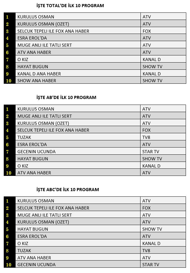 AB'de ise 1. sırada “Kuruluş Osman”, 2. sırada Atv’de yayınlanan “Müge Anlı İle Tatlı Sert” 3. sırada “Kuruluş Osman” dizisinin özeti yer aldı.