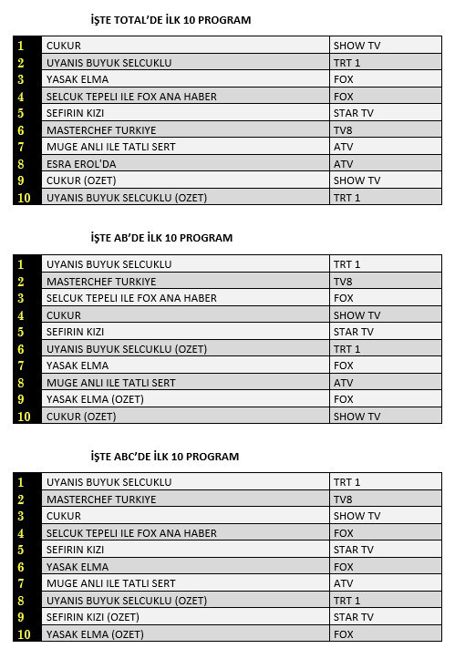 AB'de ise 1. sırada “Uyanış Büyük Selçuklu”, 2. sırada “Masterchef Türkiye”, 3. sırada “Selçuk Tepeli İle Fox Ana Haber” yer aldı.