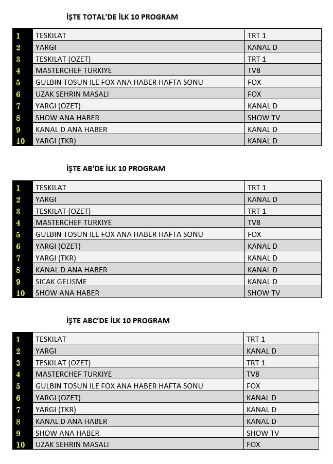 Total'de 1. sırada TRT1’de yayınlanan “Teşkilat” 2. sırada Kanal D’de izleyiciyle buluşan “Yargı”, 3. sırada “Teşkilat” dizisinin özeti yer aldı.