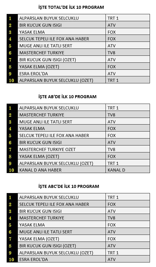 AB'de ise 1. sırada TRT1’de yayınlanan “Alparslan Büyük Selçuklu”, 2. sırada “Masterchef Türkiye” 3. sırada ATV’de ekrana gelen “Müge Anlı İle Tatlı Sert” yer aldı.