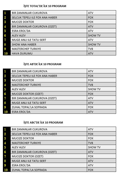 AB'de ise 1. sırada “Bir Zamanlar Çukurova”, 2. sırada “Selçuk Tepeli İle Fox Ana Haber”, 3. sırada “Mucize Doktor” yer aldı.