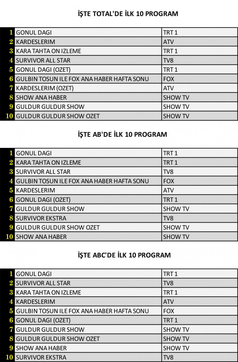 AB’de 1. sırada “Gönül Dağı”, 2. sırada “Kara Tahta Ön İzleme”, 3. sırada ise “Survivor All Star” yer aldı.