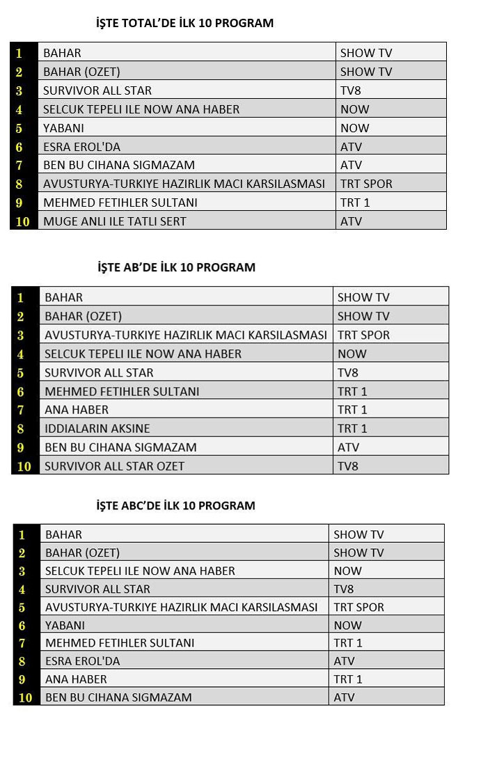 AB'de 1.sırada “Bahar”, 2.sırada “Bahar” dizisinin özeti, 3.sırada TRT Spor’da ekrana gelen “Avusturya-Türkiye Hazırlık Maçı Karşılaşması” yer aldı.