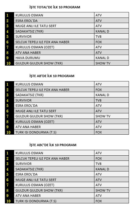 Total'de 1. sırada ATV’de ekrana gelen “Kuruluş Osman”, 2. sırada ATV’de yayınlanan “Esra Erol’da”, 3. sırada ATV’de izleyiciyle buluşan “Müge Anlı İle Tatlı Sert” programı yer aldı.