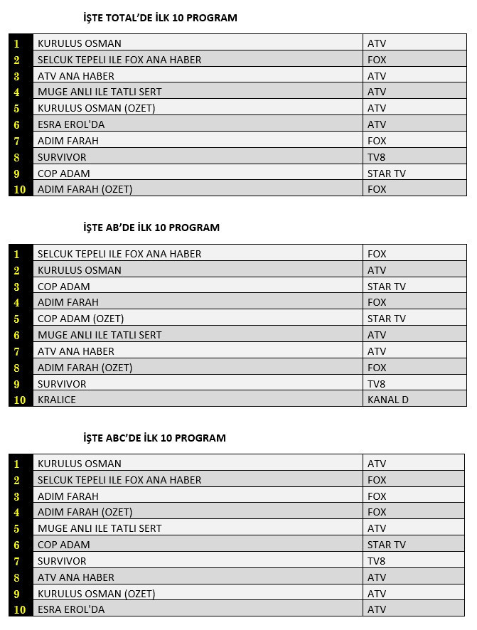 Total'de 1. sırada Atv’de izleyiciyle buluşan “Kuruluş Osman”, 2. sırada “Selçuk Tepeli İle Fox Ana Haber”, 3. sırada “Atv Ana Haber” yer aldı.