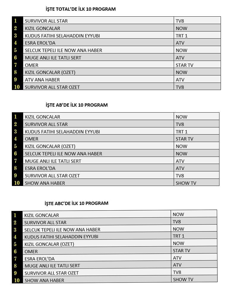ABC'de ise 1.sırada “Kızıl Goncalar”, 2.sırada “Survivor All Star”, 3.sırada “Selçuk Tepeli İle Now Ana Haber” yer aldı.
