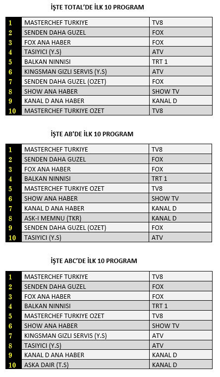 AB'de ise 1. sırada “Masterchef Türkiye”, 2. sırada “Senden Daha Güzel” 3. sırada “Fox Ana Haber” yer aldı.