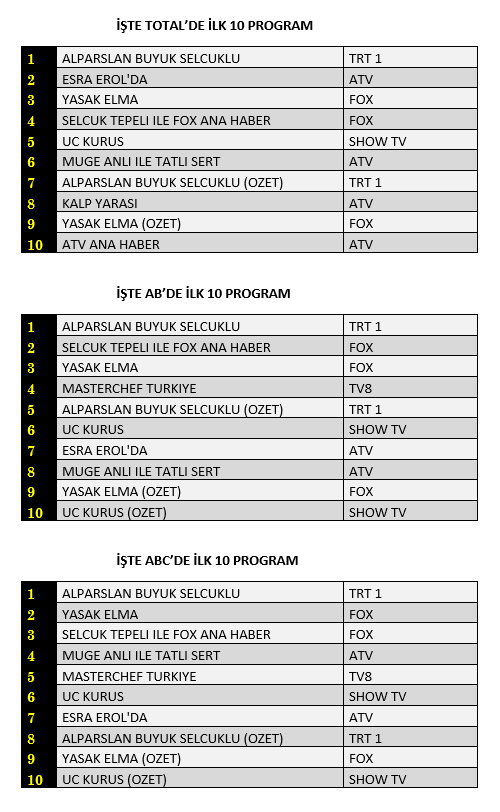 AB'de ise 1.sırada “Alparslan Büyük Selçuklu”, 2.sırada “Selçuk Tepeli İle Fox Ana Haber” 3.sırada “Yasak Elma” yer aldı.