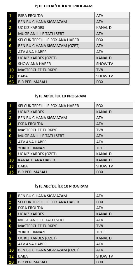 AB'de ise 1.sırada “Selçuk Tepeli İle Fox Ana Haber”, 2.sırada yine “Üç Kız Kardeş”, 3.sırada “Ben Bu Cihana Sığmazam” yer aldı.