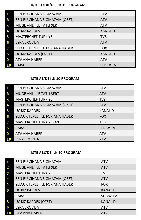 AB'de ise 1. sırada “Ben Bu Cihana Sığmazam”, 2. sırada “Müge Anlı İle Tatlı Sert” 3. sırada TV8’de yayınlanan “Masterchef Türkiye” yer aldı.