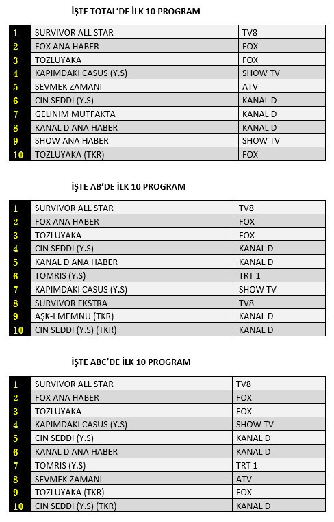 Total'de 1. sırada TV8’de izleyiciyle buluşan “Survivor All Star”, 2. sırada “Fox Ana Haber”, 3. sırada Fox TV’de ilk bölümü yayınlanan “Tozluyaka” yer aldı.