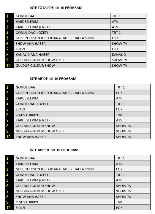Total'de 1.sırada TRT1’de izleyiciyle buluşan “Gönül Dağı”, 2. sırada ATV’de yayınlanan “Kardeşlerim”, 3.sırada “Kardeşlerim” dizisinin özeti yer aldı.