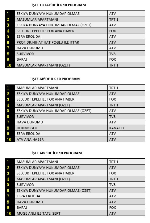 AB'de ise 1.sırada “Masumlar Apartmanı”, 2. sırada “Eşkıya Dünyaya Hükümdar Olmaz”, 3. sırada “Selçuk Tepeli İle Fox Ana Haber” yer aldı.
