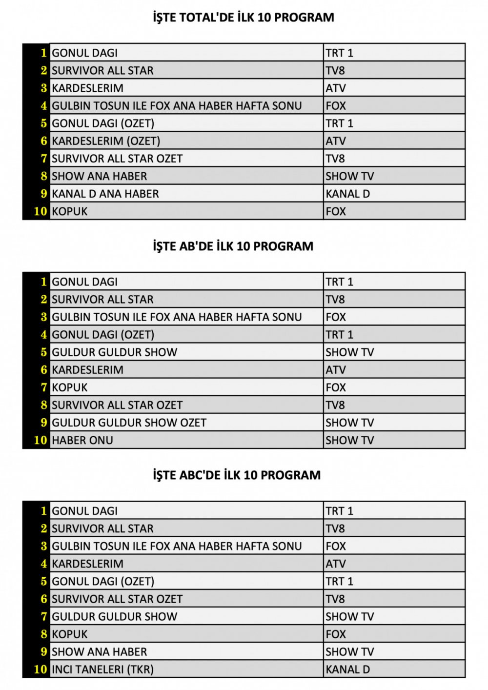 Total’de 1. sırada TRT 1’de izleyici ile buluşan “Gönül Dağı”, 2. sırada TV8’de ekranlara gelen “Survivor All Star”, 3. sırada ise ATV’de yayınlanan “Kardeşlerim” yer aldı.