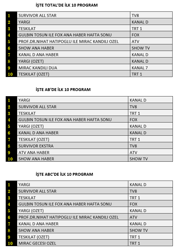 Total'de 1. sırada TV8’de ekrana gelen “Survivor All Star” 2. sırada Kanal D’de yayınlanan “Yargı”, 3. sırada TRT1’de izleyiciyle buluşan “Teşkilat” yer aldı.