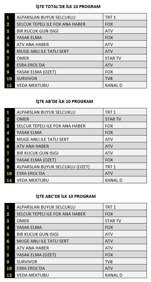AB'de ise 1.sırada “Alparslan Büyük Selçuklu”, 2.sırada Star TV’de yayınlanan “Ömer”, 3.sırada “Selçuk Tepeli İle Fox Ana Haber” yer aldı.