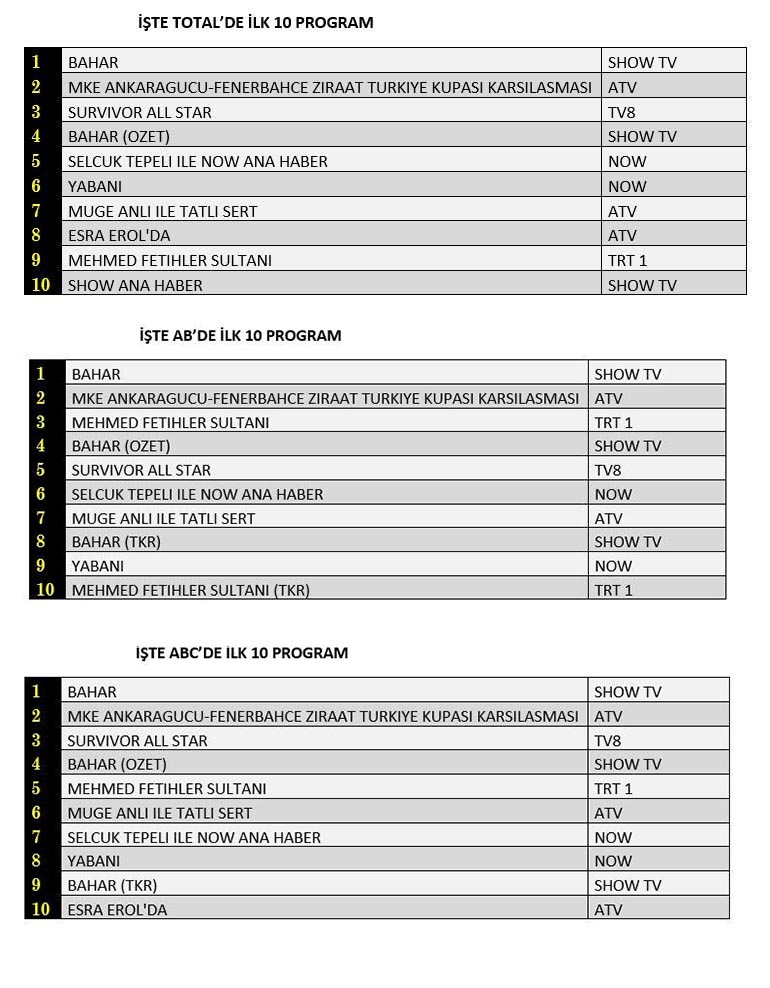 ABC’de ise 1.sırada “Bahar”, 2. sırada “MKE Ankaragücü-Fenerbahçe Ziraat Türkiye Kupası Karşılaşması”, 3.sırada “Survivor All Star” yer aldı.