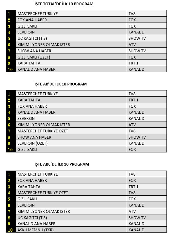 AB'de ise 1. sırada “Masterchef Türkiye”, 2. sırada TRT1’de yayınlanan “Kara Tahta”, 3. sırada “Fox Ana Haber” yer aldı.