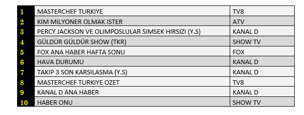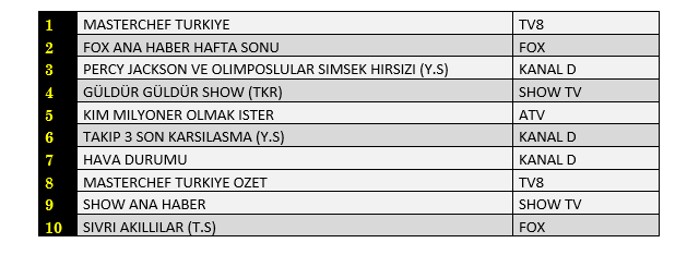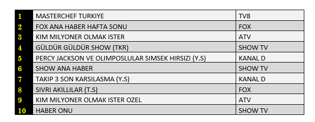 Total'de 1.sırada TV8’de ekrana gelen “Masterchef Türkiye”, 2. sırada “Fox Ana Haber Hafta Sonu”, 3.sırada ise ATV’de yayınlanan “Kim Milyoner Olmak İster"isimli yarışma programı yer aldı.