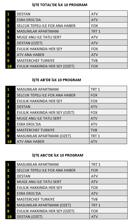 AB'de ise 1. sırada TRT1’de yayınlanan “Masumlar Apartmanı”, 2. sırada “Selçuk Tepeli İle Fox Ana Haber” 3. sırada Fox TV’de ekrana gelen “Evlilik Hakkında Her Şey” yer aldı.