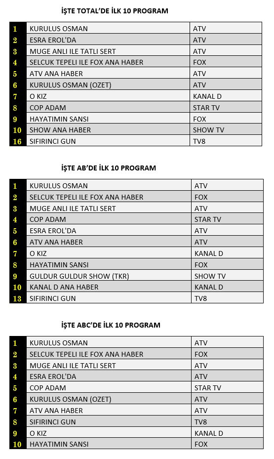 AB'de ise 1.sırada “Kuruluş Osman”, 2.sırada yine “Selçuk Tepeli İle Fox Ana Haber”, 3.sırada “Müge Anlı İle Tatlı Sert” yer aldı.